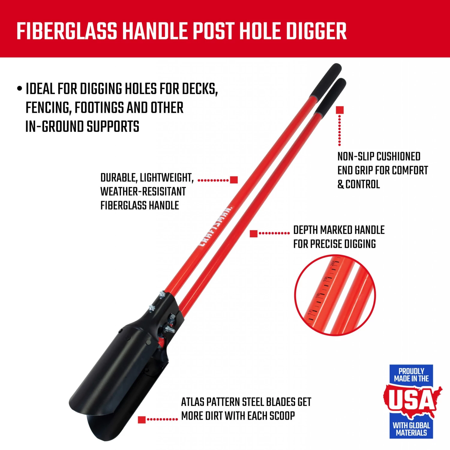 The CRAFTSMAN fiberglass handle post hole digger is used for digging holes for decks, fencing, footings and other in ground supports. Features measurement depth marked handles and 2 piece atlas blade design. If your next project involves installing a fence, basketball post or mailbox the CRAFTSMAN fiberglass post hole digger is the right tool for the job.