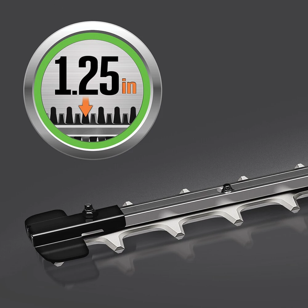 The EGO POWER+ 25 in. Hedge Trimmer has a high-efficiency brushless motor which allows for longer run time, low vibrations, and extended tool life. The 25 in. dual action, double-sided steel blades allow precise, clean cuts. The trimmer is also equipped with fully serviceable blades to make sharpening quick and easy. The 180-degree rotating handles offers ultimate control in challenging conditions. Delivering up to 3,200 strokes per minute to get the tough jobs done faster. Compatible with all EGO POWER+ ARC Lithium™ batteries to deliver Power Beyond Belief™.