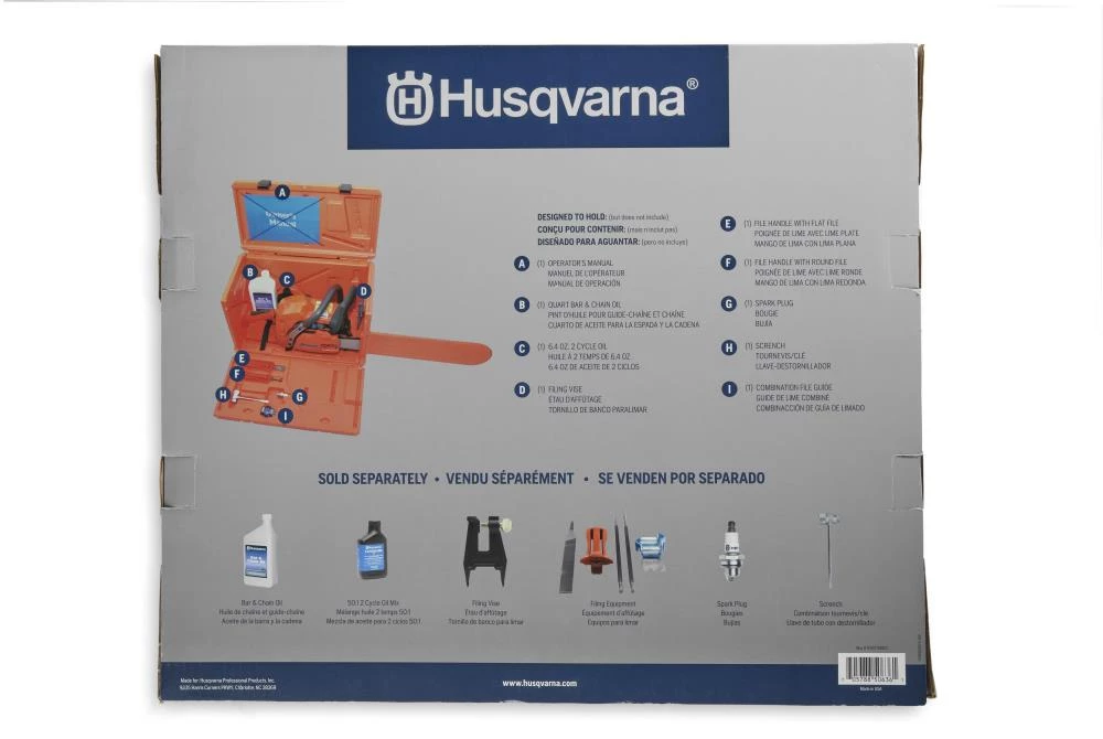 Orange, stackable and holds Husqvarna’s exclusive filing equipment, filing vise, scrench, spark plug, 2 cycle oil, bar and chain oil.