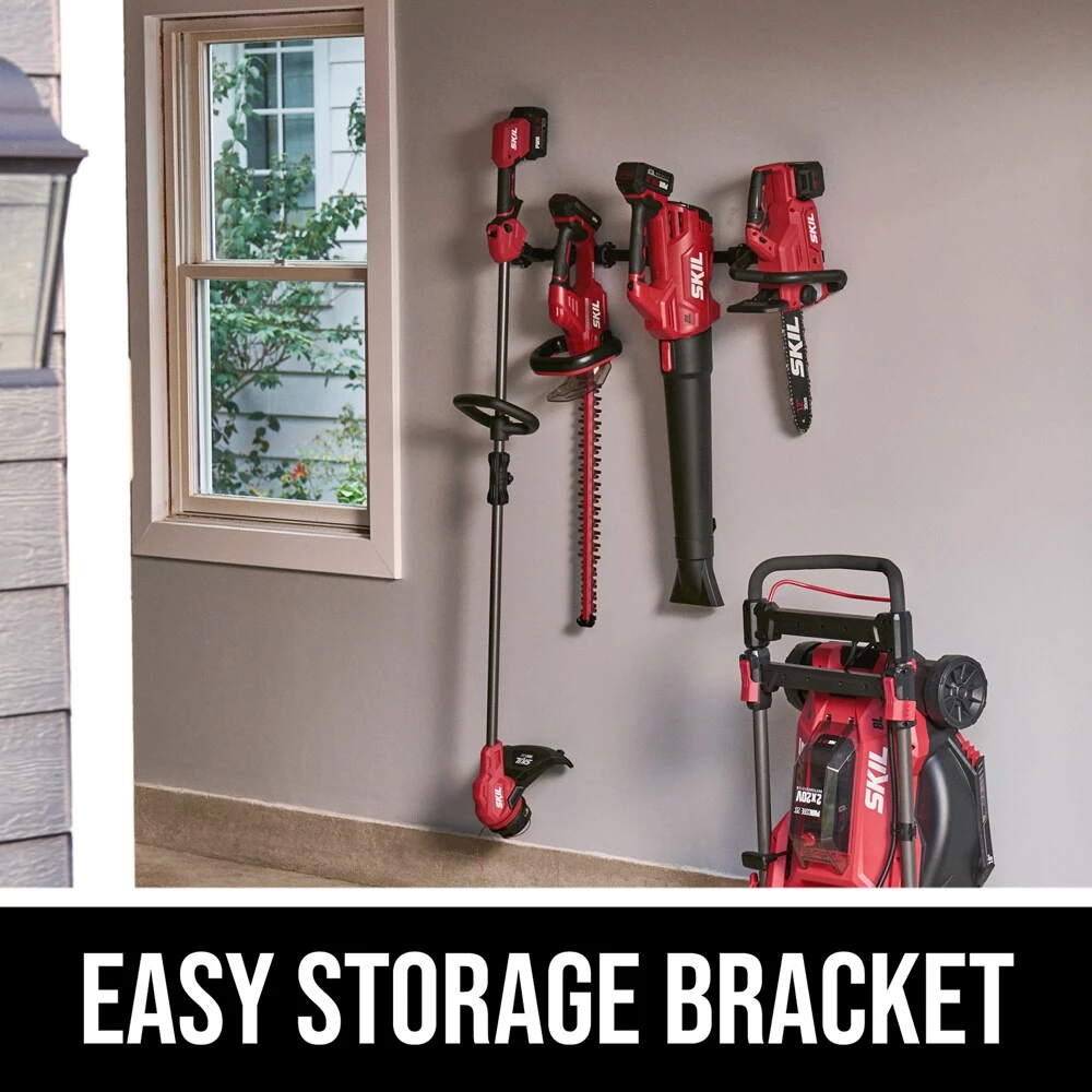 - EASY STORAGE BRACKET – This string trimmer and blower combo kit comes equipped with Easy Storage Hook and Bracket to conveniently store all your SKIL PWR CORE 20™ outdoor equipment with ease